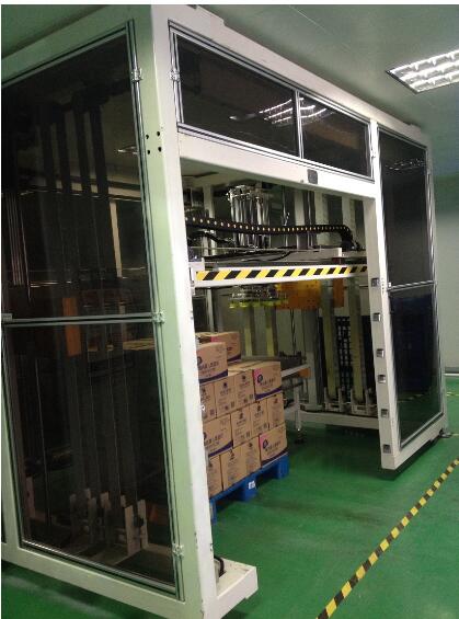 將產品通過進料輸送帶輸送進料,升降機移載著機械手夾具到產品上方,升降機構下降抓取產品后平穩(wěn)上升,水平移動到棧板位,按事先輸入的碼垛形式進行產品碼放。碼垛裝置是依靠伺服電機和鏈條傳動來同步運行控制,確保產品碼放位置淮確。